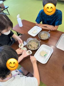 包む工程では、最初は難しそうにしていた児童さんも、職員やお友達に教えてもらいながら上手に包めるように✨