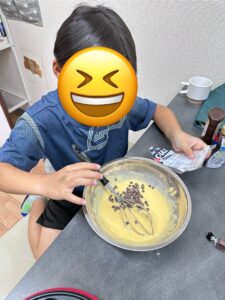 生地作り、流し入れる担当、チョコを入れる担当、ひっくり返す担当…