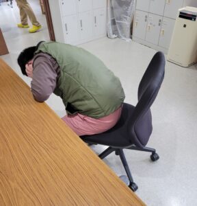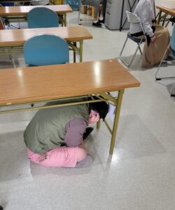 煙を吸わないようになるべく姿勢を低くする、頭を守る、机の下にもぐる、安全確認後外へ避難など実施しました。