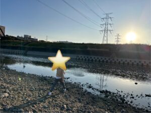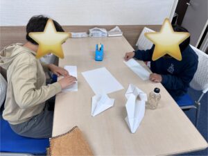 紙飛行機を折ったり、外で石を投げて遊んだり(水切り遊び)。