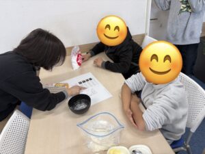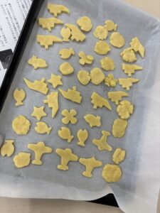 必要な材料を準備して分量を量って、混ぜて、こねて、形を作って、焼いて・・・みんなで協力して行いました。