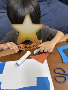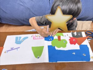 はじめに好きな色や形を選び、ハサミで切ったり、のりで貼ったりしながら、自分だけの世界を表現していきます😊